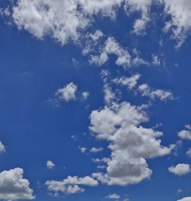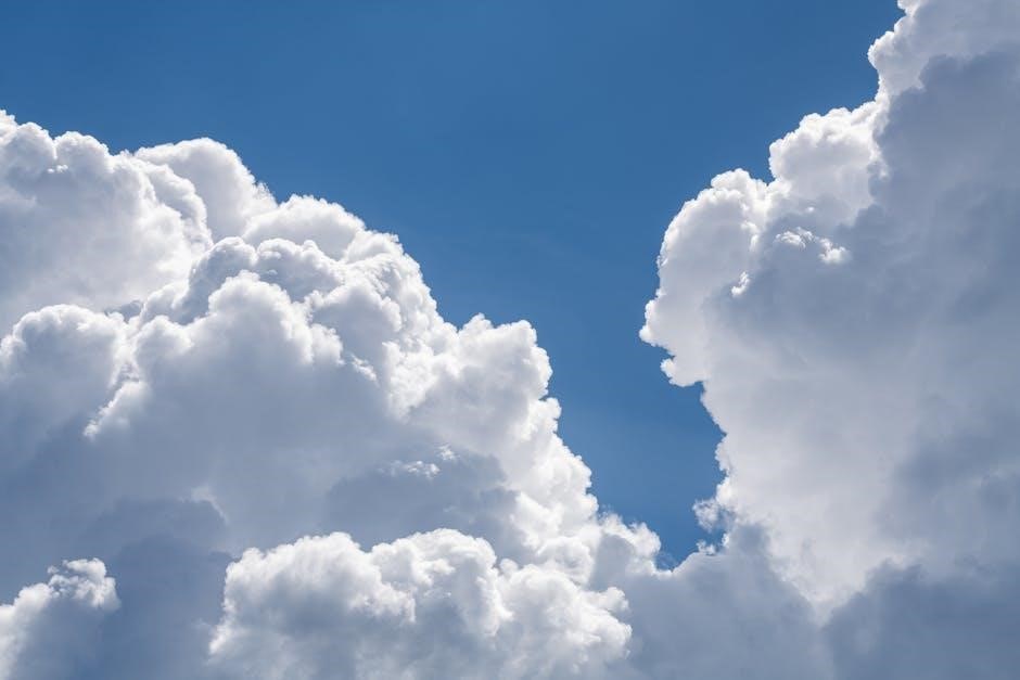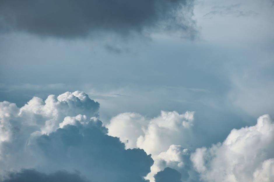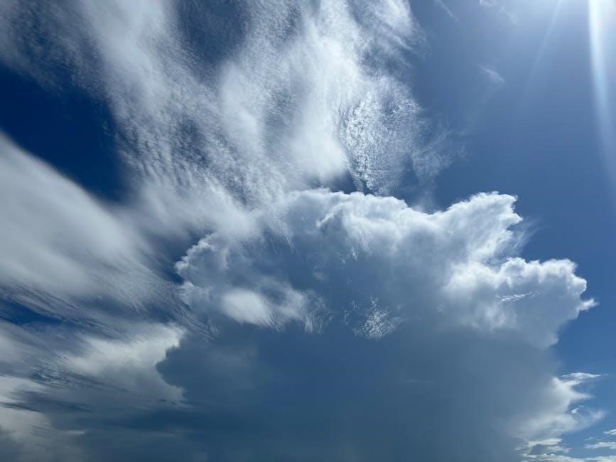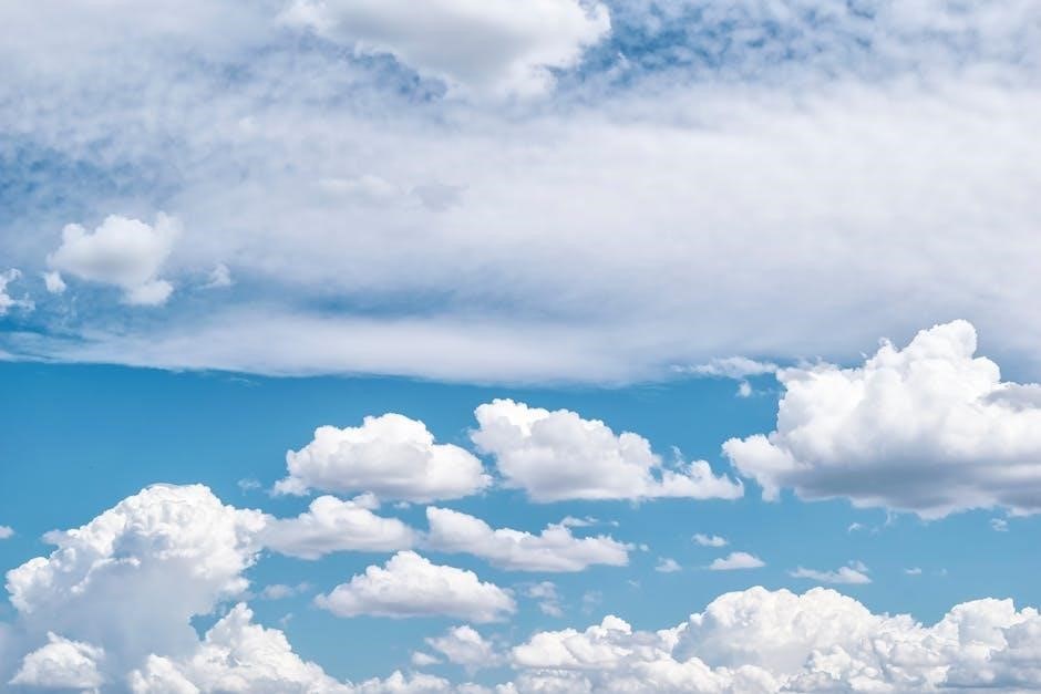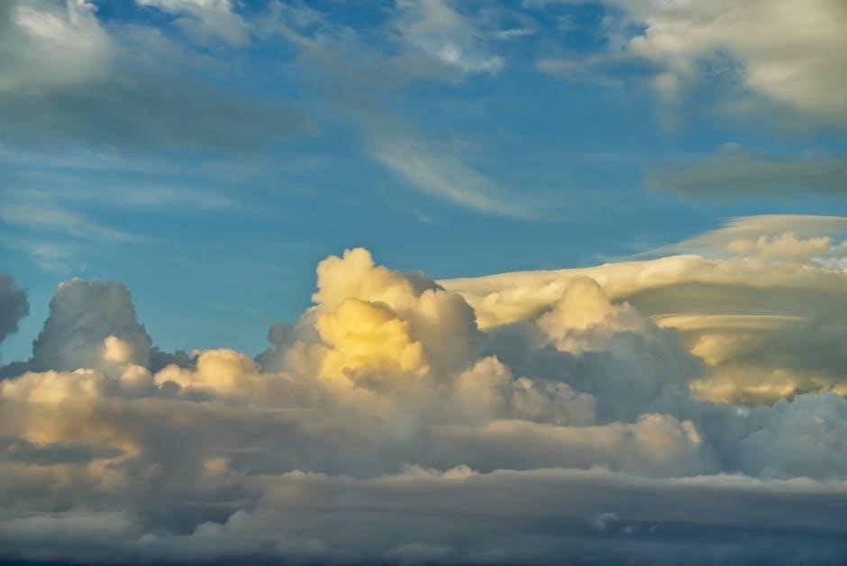 Guides emphasize that identifying these clouds requires careful observation of their shape, texture, and altitude. Pretor-Pinney’s work and resources from organizations like the Met Office provide detailed descriptions and imagery to aid in accurate classification, helping enthusiasts deepen their understanding of atmospheric processes and predictive capabilities.