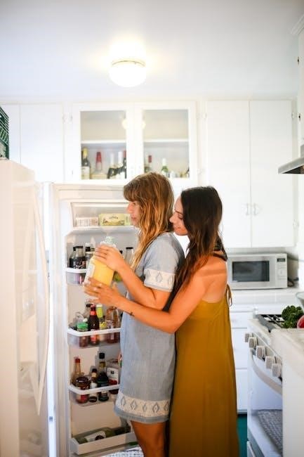 Temperature Settings: Set the refrigerator temperature between 37°F and 40°F (3°C and 4°C) and the freezer at 0°F (-18°C). Lowering temperatures unnecessarily increases energy consumption; Allow hot foods to cool before placing them inside‚ preventing the refrigerator from working harder.